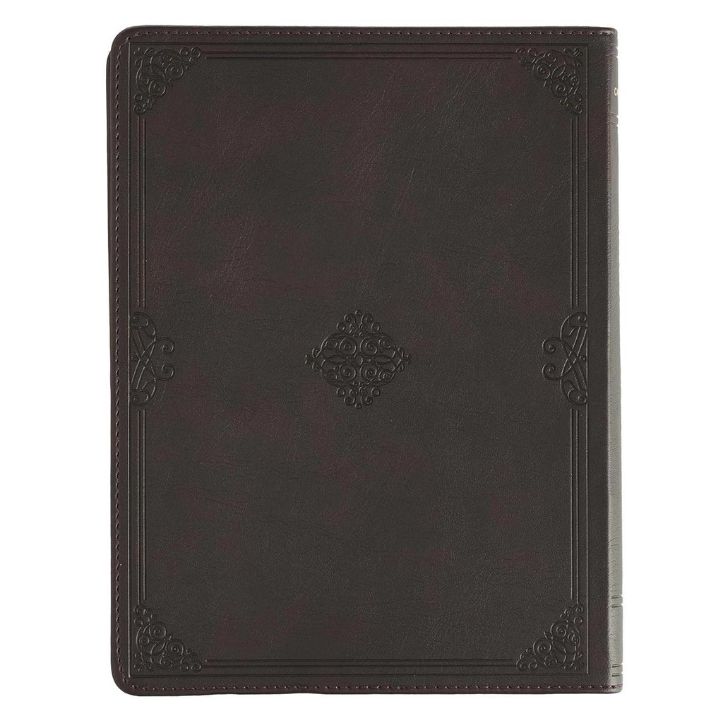 The rich brown faux leather cover of the devotional is embellished with a subdued heat debossed frame with corner scrolls. The gold foiled title is sandwiched between two flourishes and matches the gold foiled subtitle right below it.