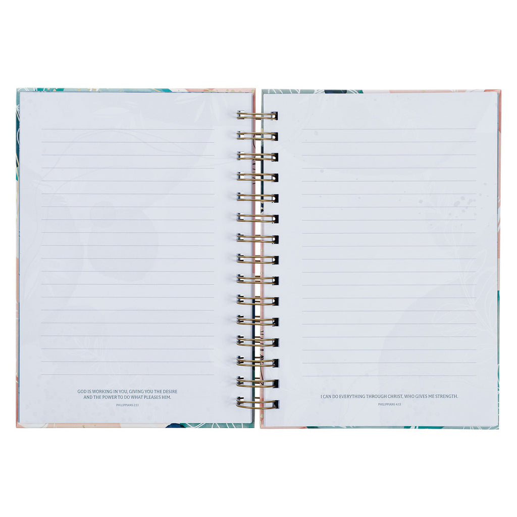 The journal's golden-toned wire binding secures 192 pages of creamy white, lined paper. Each page bears a hand-picked Bible verse for daily inspiration, and the hardcovers flip easily, serving as a handy writing surface.