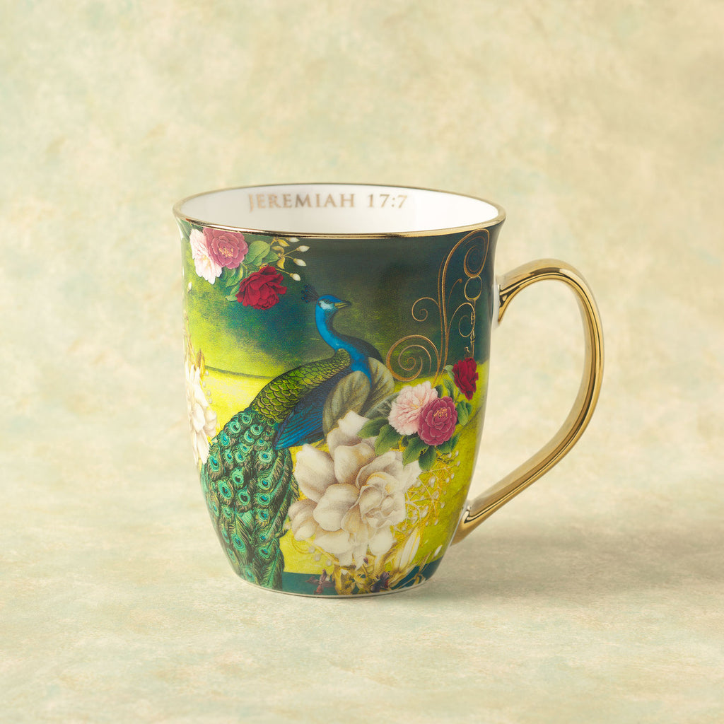The Blessed Blue Peacock Ceramic Coffee Mug is part of the Blessed Blue Peacock Secret Garden Collection that includes a ceramic mug, a stainless steel travel mug, a faux leather Bible cover, a hardcover journal, a faux leather journal, a glass water bottle, a reusable tote bag, a notebook set, and a gift bag.