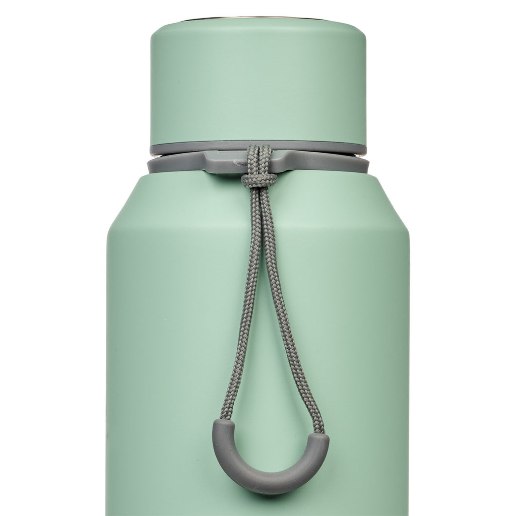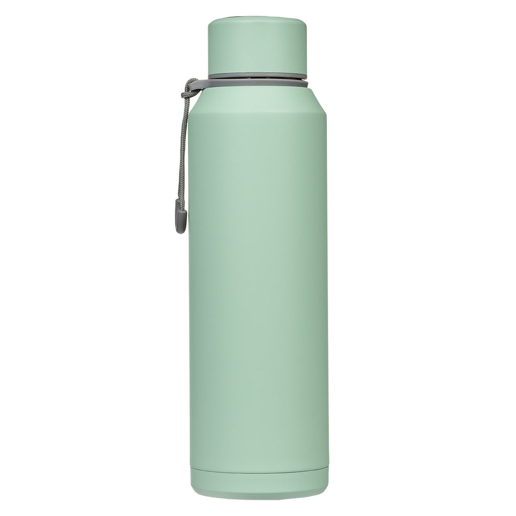 The exterior of the water bottle is powder coated in a scratch-resistant finish with a smooth feel. The twist-off lid is covered in the same finish and has a silicone seal to prevent leaks. A 1.5-inch mouth opening is wide enough to accommodate ice cubes or bottle brushes for cleaning. A gray rim separates the cap from the bottle's body and sports a woven cord loop with a gray plastic finger hook that frees up your hands when carrying it. As with all water bottles, hand-washing with soap and warm water is best. The water bottle comes packed in a full-color printed tuck-top gift box that is easy to wrap.