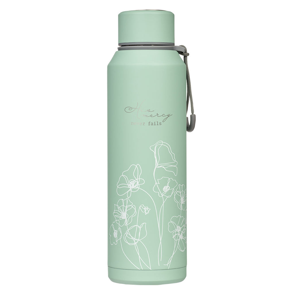 The Mercy Hazy Teal Stainless Steel Water Bottle is part of the Pastel Meadow Collection, designed to celebrate and testify to God's great mercies. This collection includes a ceramic planter pot with a saucer, faux leather Bible case, magnet set, large notebook set, wirebound journal, faux leather journal, ceramic coffee mug, and gift bag.
