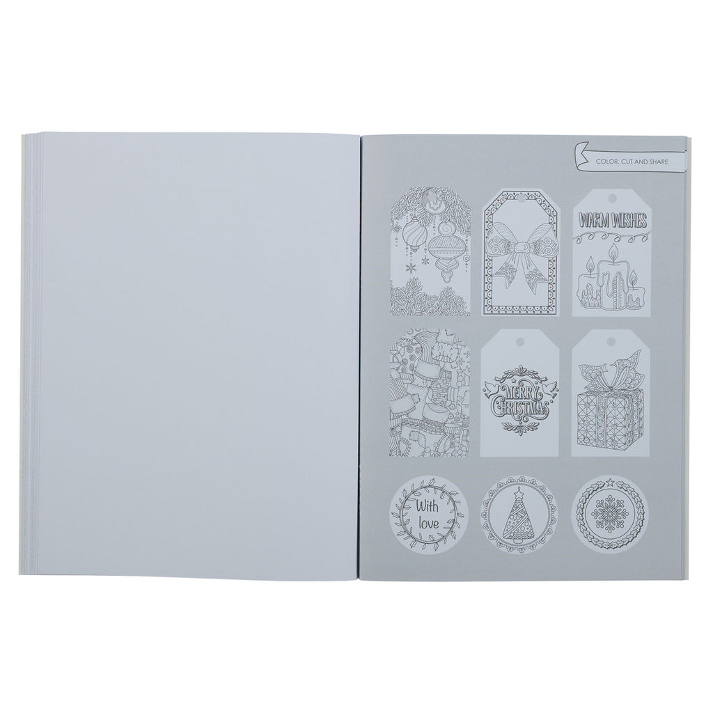 The coloring book pages are perforated to make them easy to remove. The fun starts at the very first page —a presentation page that can be colored and personalized. The coloring book further contains 24 full-page Christmas-themed line-drawn illustrations to color. Each illustration is paired with a Christmas-themed Scripture verse to color as you meditate on its meaning. Additionally, 6 pages feature a variety of cards and gift tags you can color, cut out, and share.