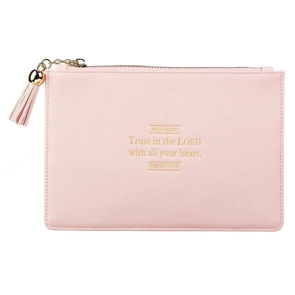 Perfect for taking on the go, this Trust in the Lord LuxLeather Pouch is a beautiful and functional accessory. The pouch features beautiful pink blush LuxLeather, which is durable and has the same luxurious feel as leather. It features Proverbs 3:5, “Trust in the Lord with all your heart,” on the front in foiled text. A blush tassel zipper pull gives a nice finishing touch to this pouch. Use it to carry around makeup, pencils or coins. It's a fashionable way to tote your small nicknacks.