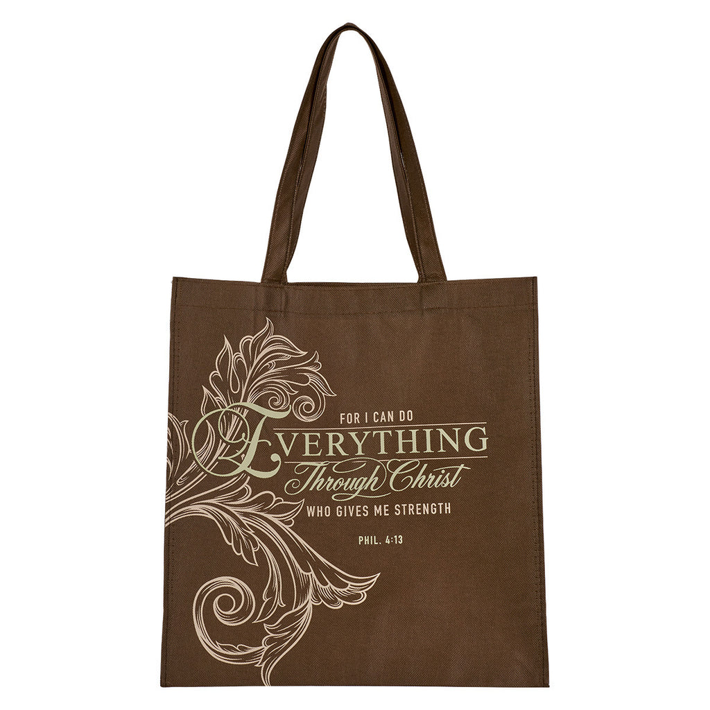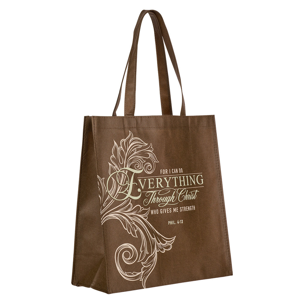 Use the eco-friendly and reusable Everything Through Christ Fluted Iris Shopping Tote Bag to pack an impromptu picnic for your family, or use it to bring a housewarming gift to your friend.