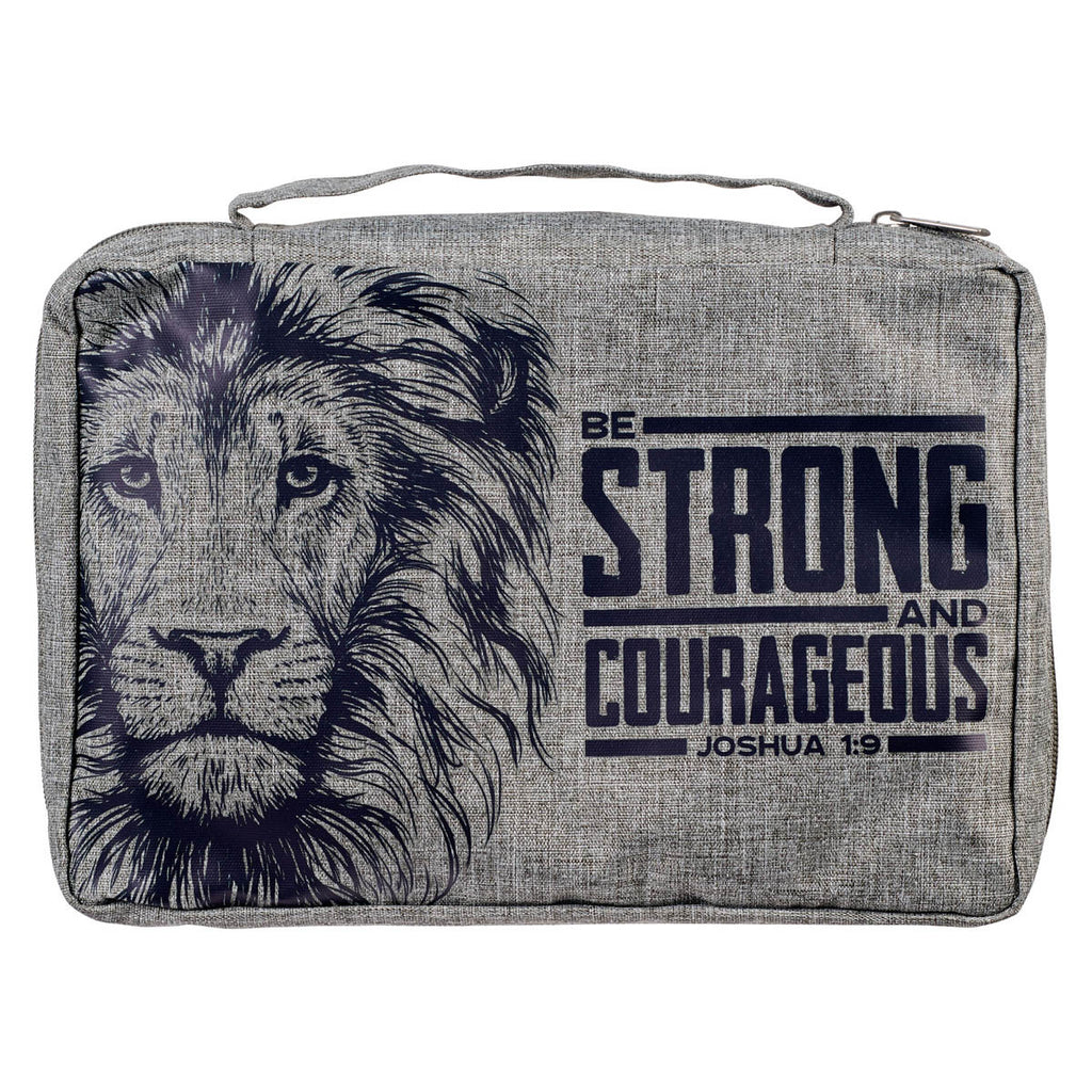 Store your Bible in a sturdy Bible case with a fierce and encouraging message when you use the Strong and Courageous Lion Gray Value Bible Cover—a Bible case with a dramatic design to complement a positive message.