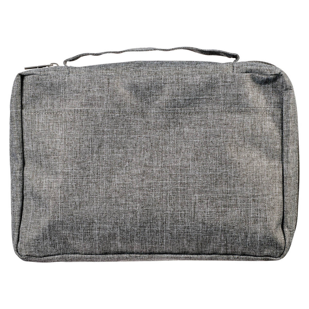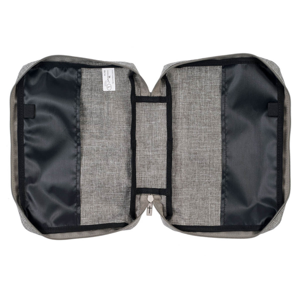 A slip pocket on the back of the Bible case is useful for storing a church bulletin, notebook, or notes. A silver engraved zipper pull attached to the durable poly-canvas cover closes securely to keep your Bible safe. To further protect your Bible, a lay-flat handle folds completely flat to prevent any damage to the spine when the Bible and bookcase are open. An interior pen loop is included to store a pen or highlighter.