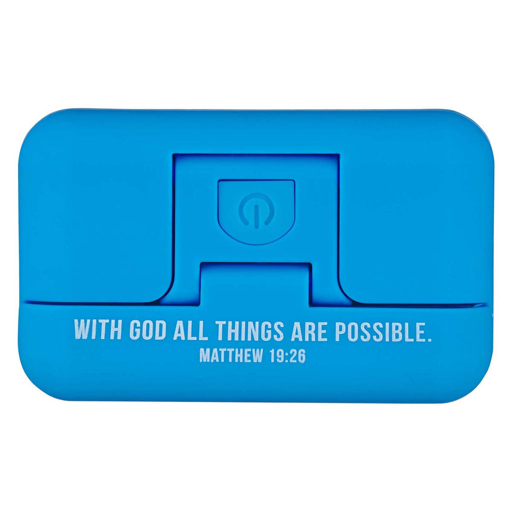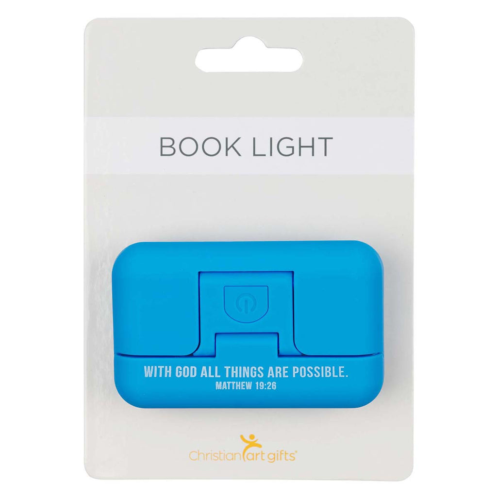 Share the With God All Things Are Possible Blue Clip-on Book Light with the book lovers and students in your life and light up the written words for those reading under the covers or those working till midnight!