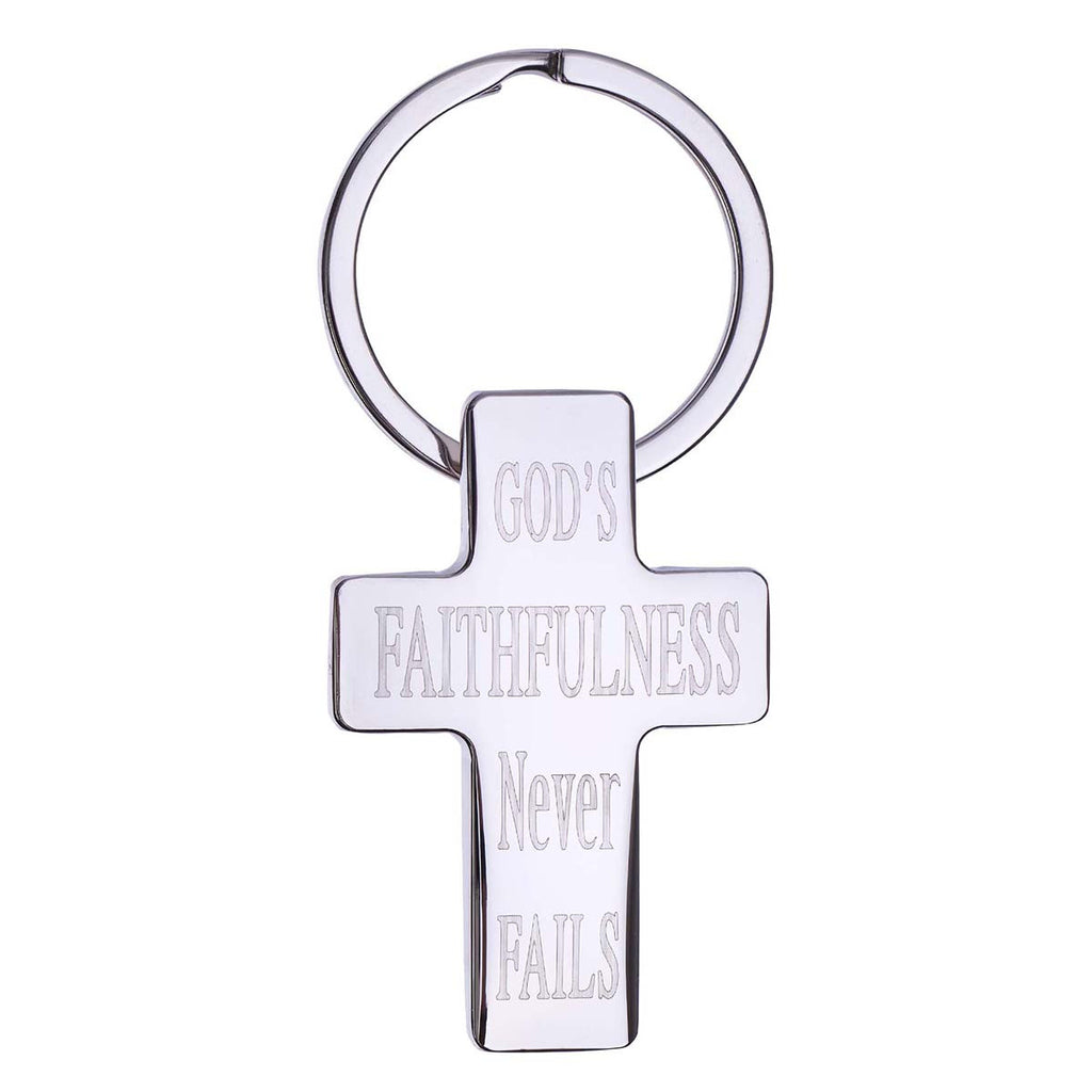 Our gleaming Christian Cross Keyring comes to you gift-ready - nicely seated in its own cross embossed tin gift box. The handsome 2" cross is etched with the reminder that "God's Love Never Fails". The cross has a substantial feel and is attached at its back to a stainless steel key ring.