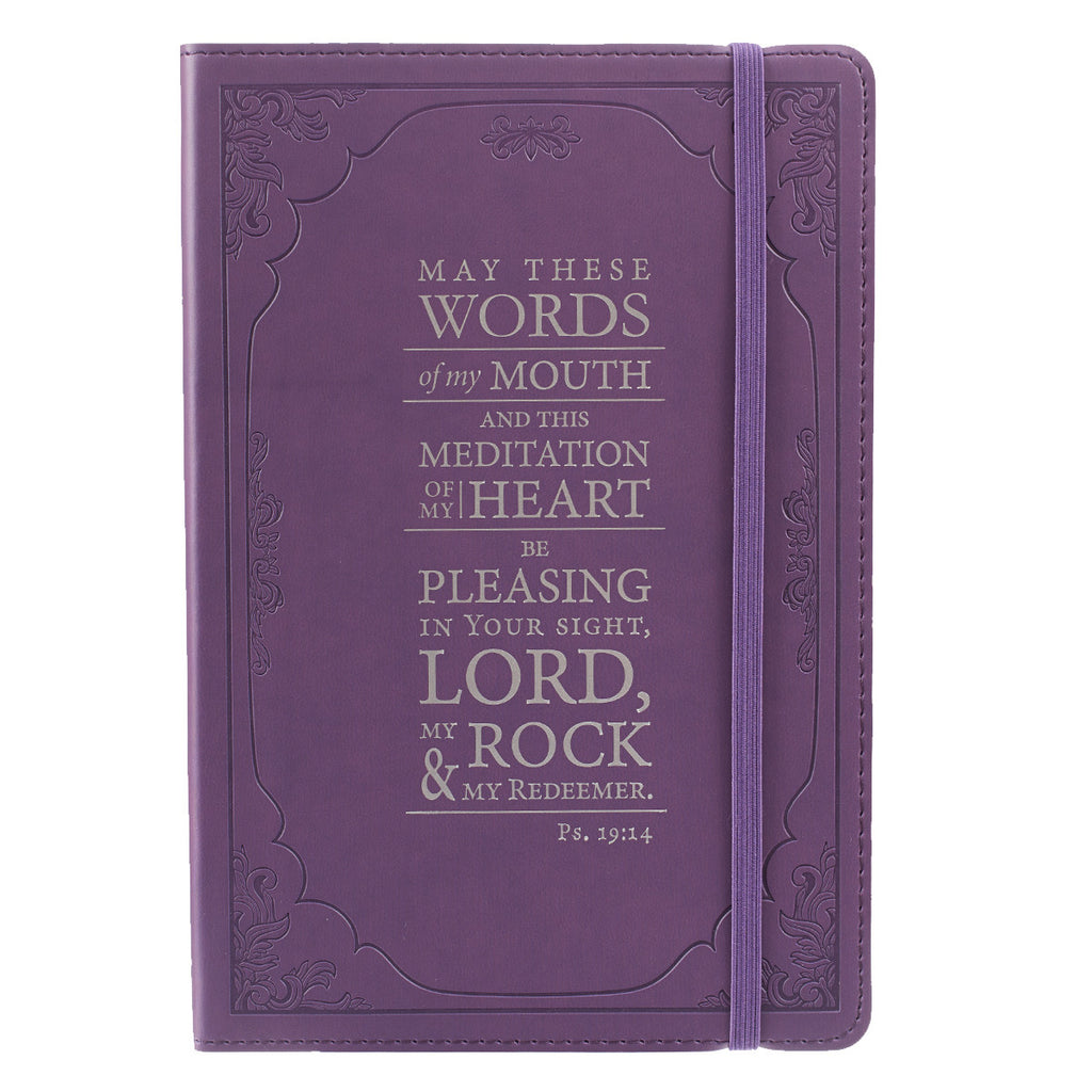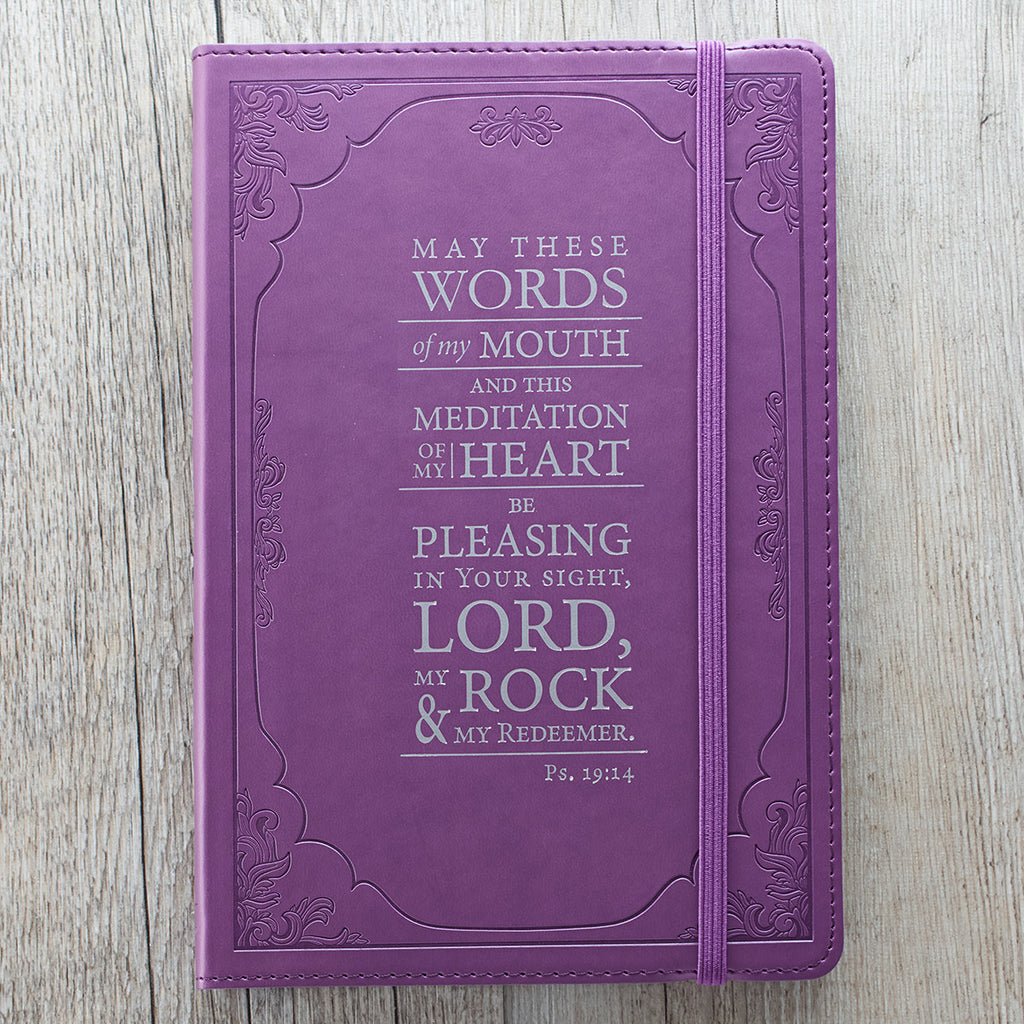 Regal and glorious, with its debossed border art and silver foil cover text, this super supple, purple, writing journal is buttery soft in your hand. Scripture from Psalm 19:14, "May these words of my mouth and this meditation of my heart be pleasing in your sight, Lord, my Rock and my Redeemer." The journal is covered in a quality man-made material with the look and feel of real leather (trade name LuxLeather), has a lay-flat spine and an attached elastic band closure to protect your pages.