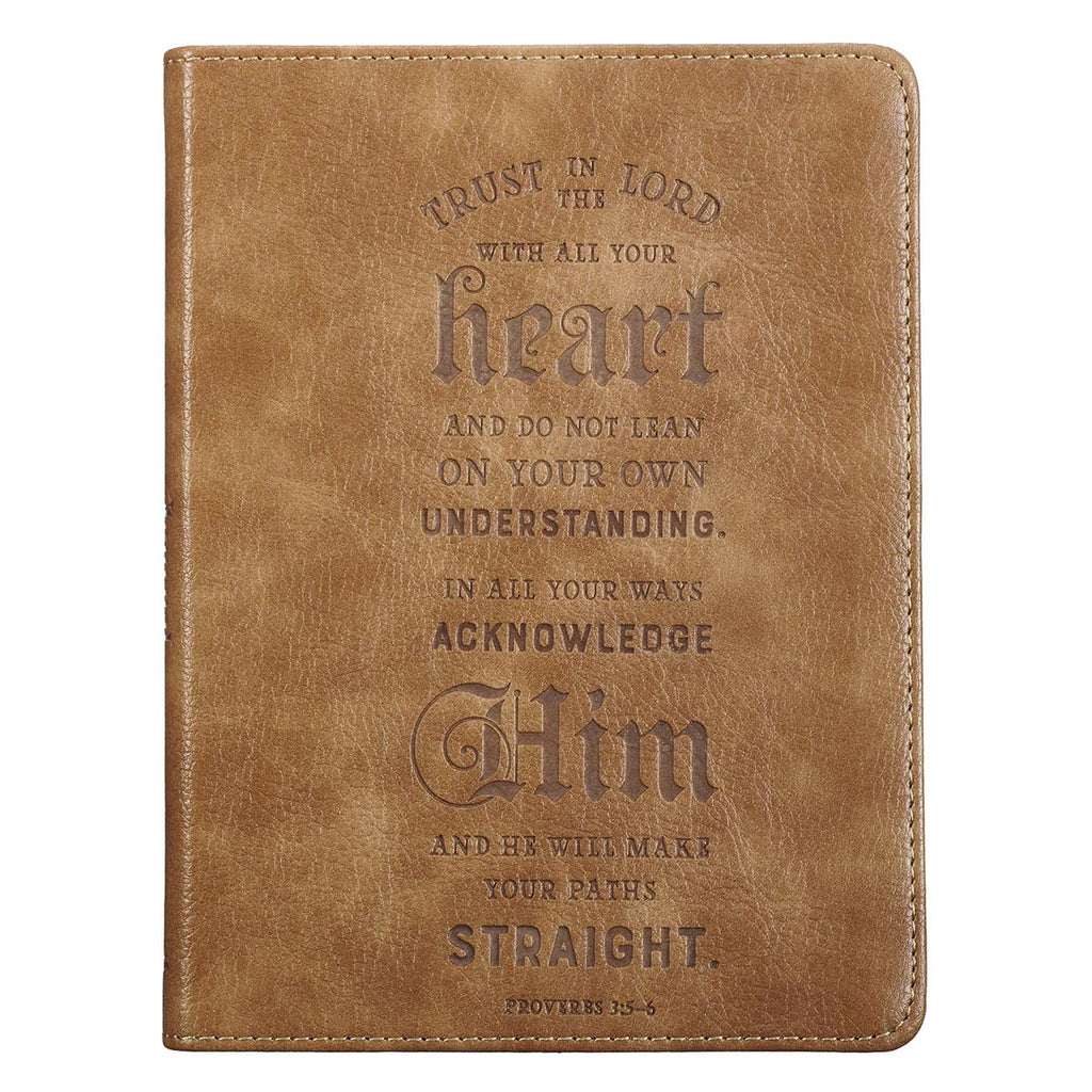 Journals are meant to be handy, and this Trust in The Lord Handy-sized Faux Leather Journal has optimal proportions to be carried and used no matter where you may go. The cover of this journal is heat-debossed with one of the Bible’s most renowned Proverbs written in a variety of fonts—from bold typewriter print to swirling, classical calligraphy—and unabashedly stating, “Trust in the Lord with all your heart and do not lean on your own understanding. In all your ways acknowledge Him, and He will make your paths straight” (Proverbs 3:5-6). Due to its smaller user-friendly size, this journal serves, not only as a means to jotting down notes and thoughts, but also as a visual reminder to put your trust in God, not man.