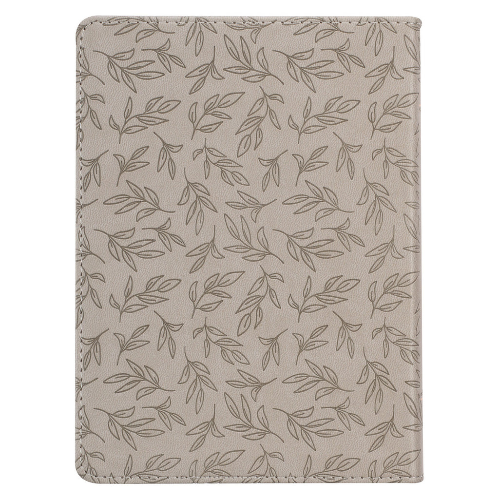 Its elegant taupe faux leather cover is adorned with scattered, heat-debossed fronds on both sides. The front cover boasts a gold-foiled frame, complemented by a heat-debossed arch design that highlights a sleek panel displaying the title. The title is presented in heat-debossed letters, further accentuated with a gold-foiled script.