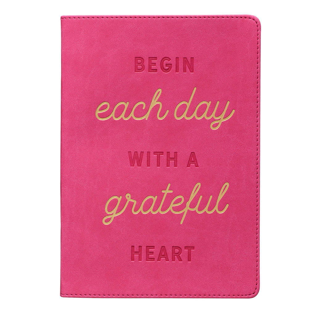 Set your intention for the day by journaling your goals in the pages of the Grateful Heart Pink Faux Leather Classic Journal, and be prepared to experience a paradigm shift in how you see the world. The classic journal's bright pink faux leather front cover features a simple heat-debossed typographically styled sentiment accented with gold foiled lettering. Begin each day with a grateful heart. Topstitching along the edges of the cover adds stability to the construction. Gilt-edged pages add a classy touch, and an attached satin ribbon maker will help you mark your page. A presentation page welcomes you to the journal and invites you to personalize it. Fill the 336 lined pages with all the blessings or record your goals and future aspirations. TheGrateful Heart Pink Faux Leather Classic Journal is the best journal for your eternal optimist best friend or your Eeyore best friend who needs a little encouragement to see the beauty around her. Typographical design with heat-debossed and gold foiled letters Pink faux leather cover Heat-debossed and gold foiled title Begin each day with a grateful heart Flexcover Attached ribbon marker Topstitched edges Gilt-edged pages 336 lined pages Packaged in an individual cellophane bag Size: 218 x 155 x 23mm