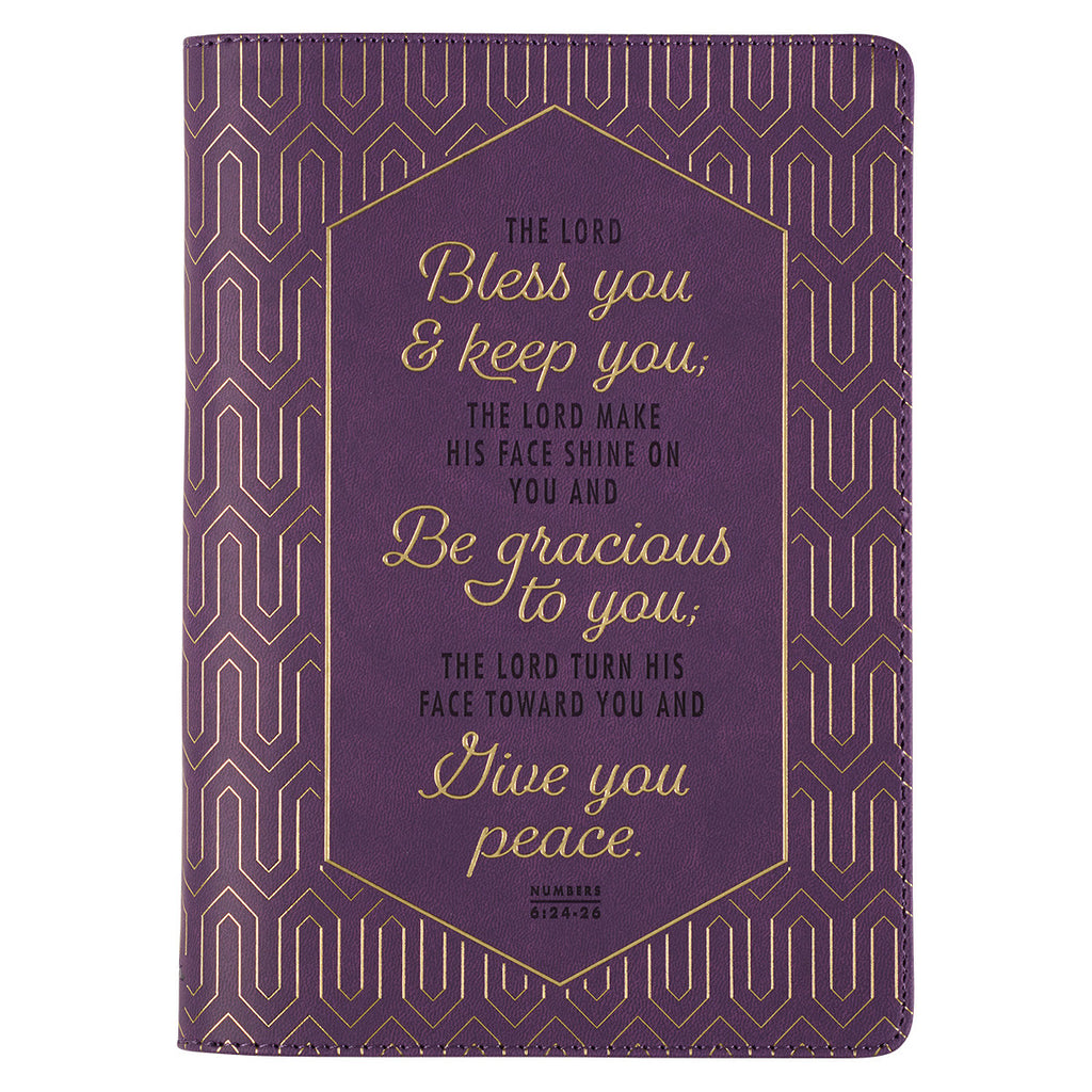 The beautiful priestly blessing from the Old Testament graces the journal's front cover. The blessing is presented in a combination of heat-debossed and gold-foiled lettering bordered by a thin diamond-shaped gold-foiled frame.
