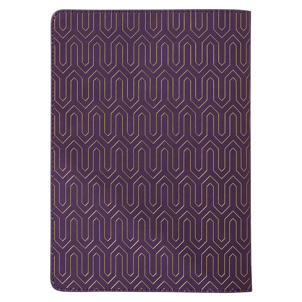 Heat-debossed geometric designs in gold foil line the front and back covers of the purple faux leather classic journal. Purple topstitching along the rounded corners of the journal adds support to the construction.