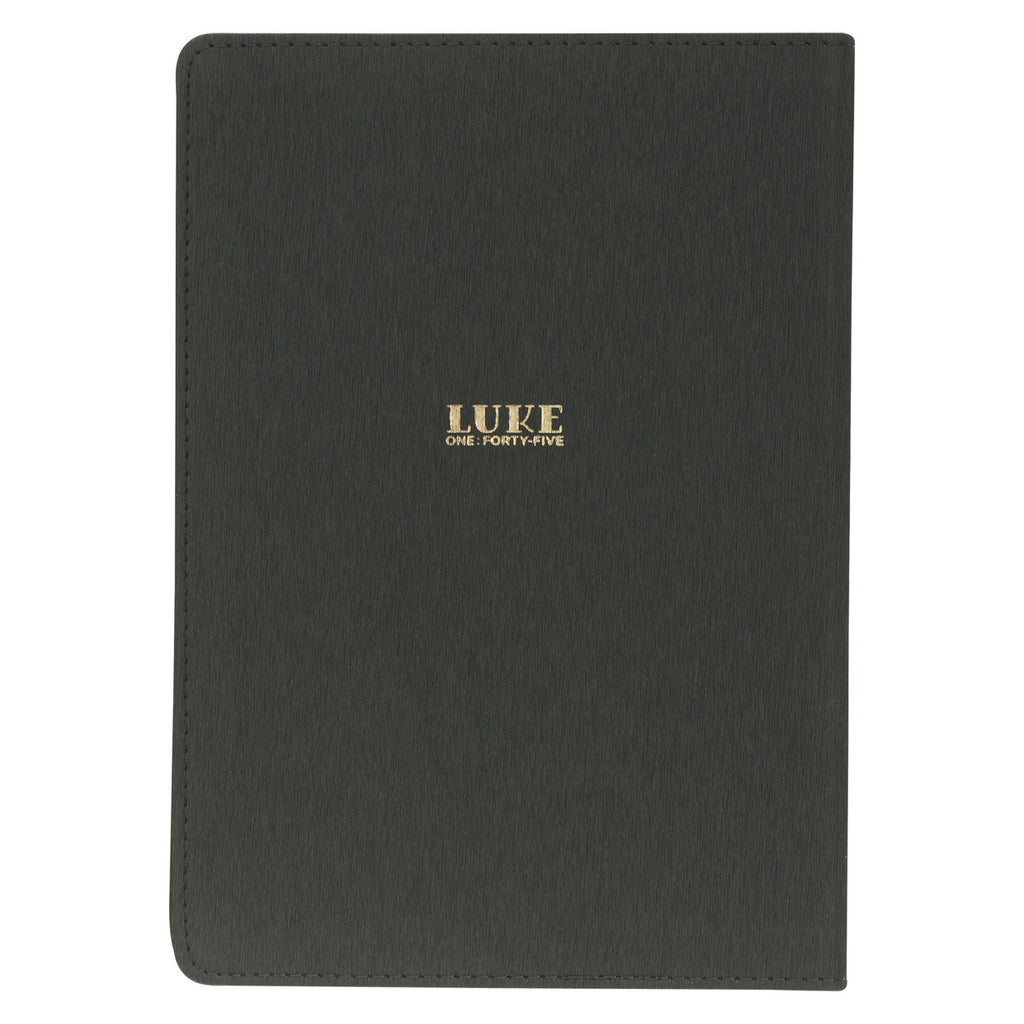 The reverse side of this journal maintains the subdued gray color scheme, accentuated by a gold-foiled Scripture reference.