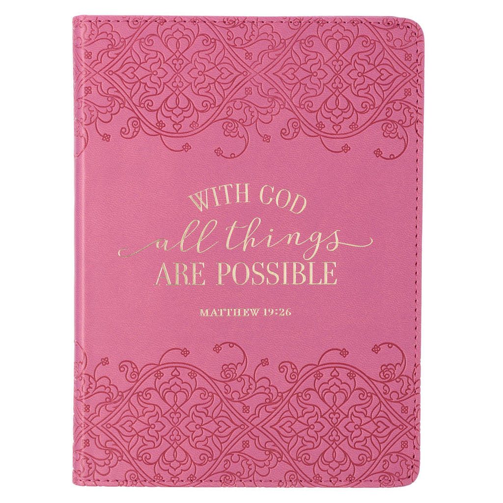 The With God All Things Are Possible Pink Handy-Sized Faux Leather Journal is a delightful journal, perfect for practicing gratitude and mindfulness. Its cheerful color, design, and Scripture title set the tone for this journal to be a place of praise, inspiration, reflection, and goal setting.