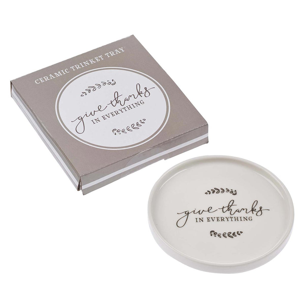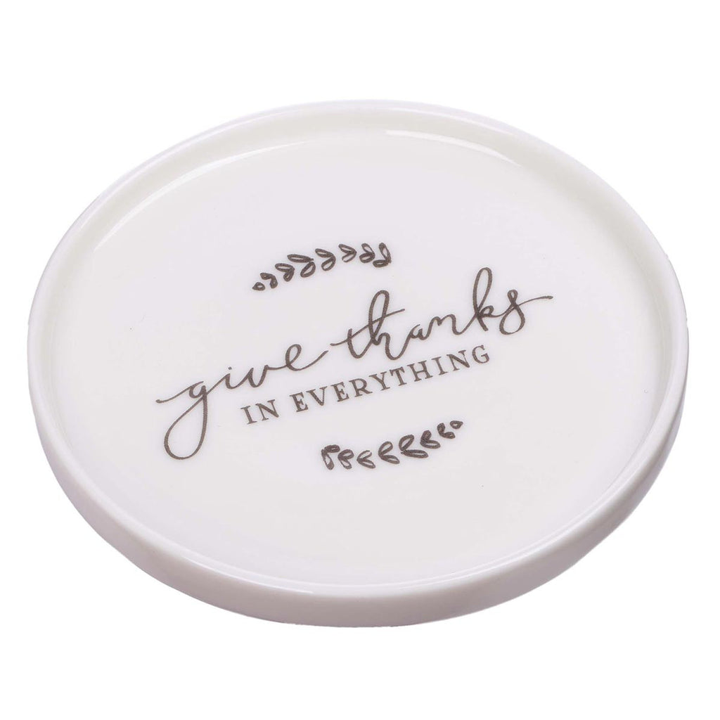 The round trinket tray is made of white ceramic, and the words "Give thanks in everything," are printed in black in the center and accented by little sprigs of thyme.