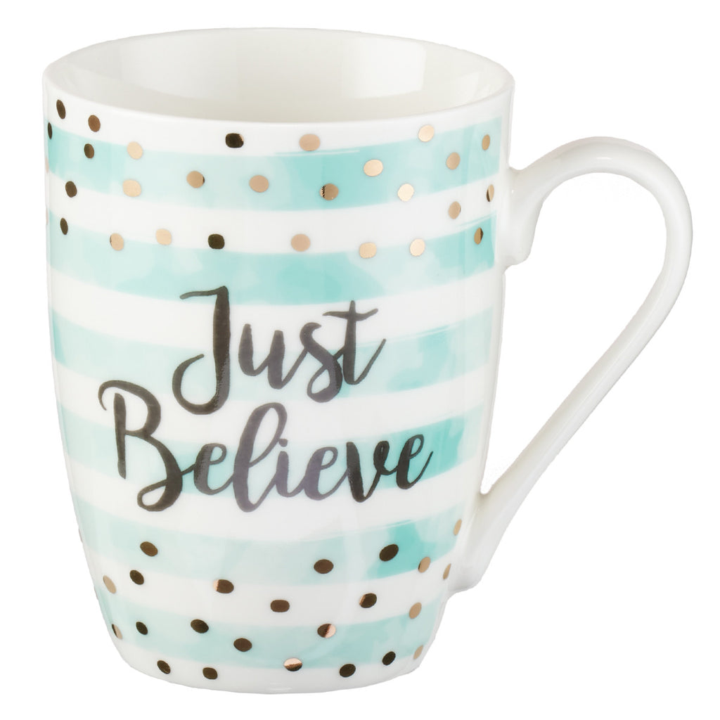 The Christian mug features a stylish design of mint pastel stripes and gold dots, along with the “Just Believe” sentiment displayed at its center.