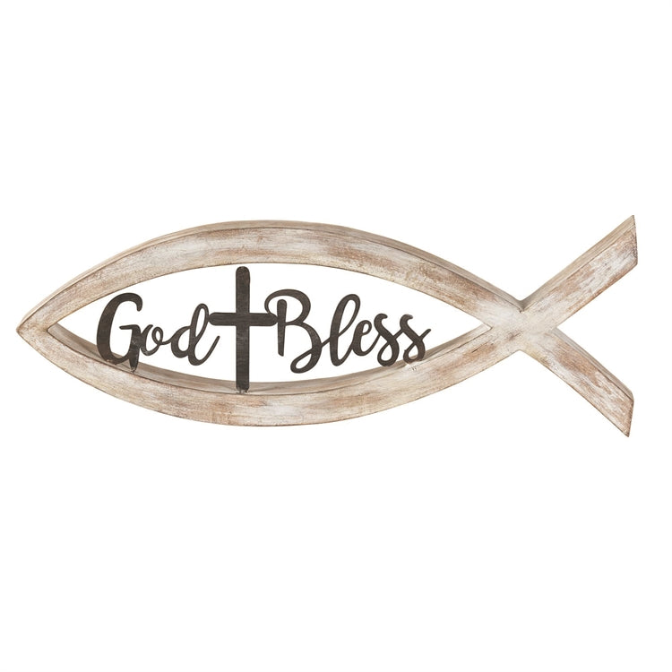 Tabletop Fish with Cross and God Bless Unique tabletop decor features a Christian fish shape with the look of whitewashed wood. Inside is a metal cross with God Bless, all finished in a bronze tone. Length of piece is approxx 37 cm, height is approxx 13 cm and depth is approxx 3 cm. Made of MDF wood and metal.