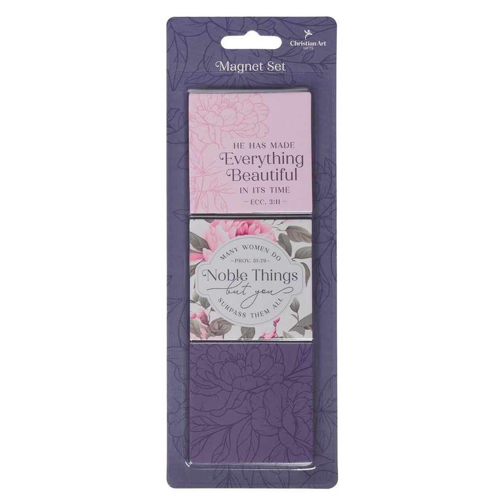 The 3-piece magnet set features a soft feminine design with white, blue, and pink florals and two inspiring Scripture verses.