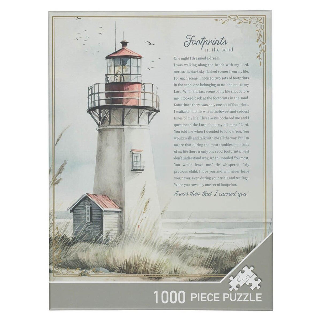 The Footprints 1000-piece Puzzle is part of the I Have Made You Lighthouse Collection. This collection includes a ceramic coffee mug, a faux leather Bible cover, a 1000-piece puzzle, a reusable shopping bag, a spiral journal, a faux leather journal with zipper closure, a spiral notebook, a large planner pad, a gift bag, magnetic bookmark set, faux leather checkbook wallet, and a faux leather bookmark.