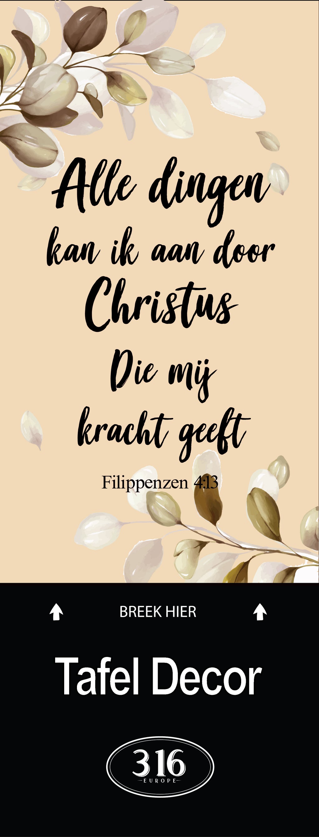 Dit FSC MDF Houtdecor is perfect voor je huis, kantoor, of als een hartverwarmend cadeau voor een dierbare die wat opbeuring kan gebruiken. Breng een boodschap van hoop en herstel in je leefruimte met dit prachtige decoratieve tafelbordje. Bestel vandaag nog en omarm de kracht van geloof en veerkracht in stijl.Tekst: Alle dingen kan ik aan dankzij Christus