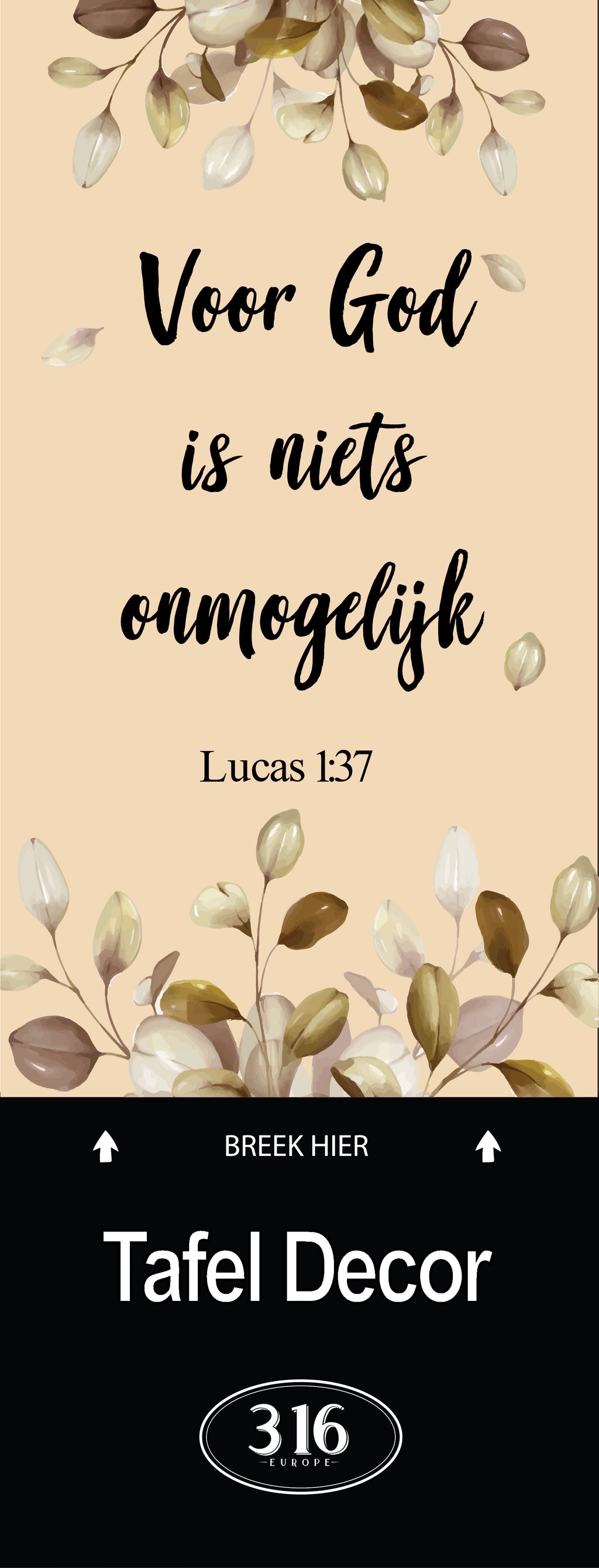 Dit FSC MDF Houtdecor is perfect voor je huis, kantoor, of als een hartverwarmend cadeau voor een dierbare die wat opbeuring kan gebruiken. Breng een boodschap van hoop en herstel in je leefruimte met dit prachtige decoratieve tafelbordje. Bestel vandaag nog en omarm de kracht van geloof en veerkracht in stijl.Tekst: Voor God is niets onmogelijk Lukas1 37