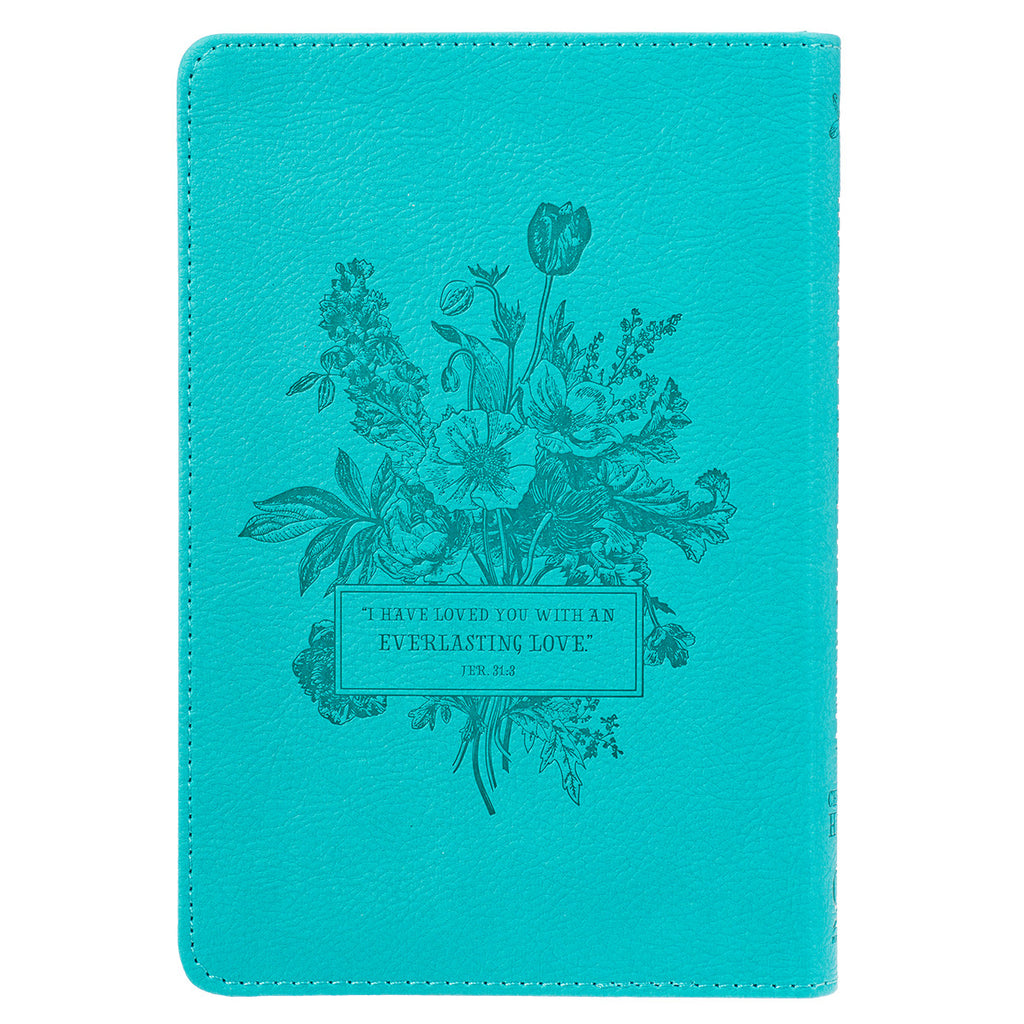 The back cover features a heat debossed floral bouquet and a framed Scripture verse from the Book of Jeremiah.