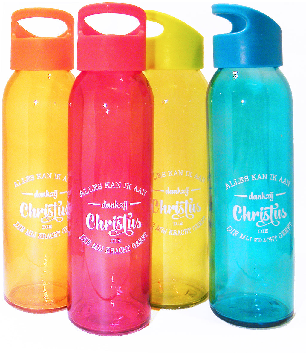 Geen dorst meer mat deze herbruikbare stevige glazen fles.