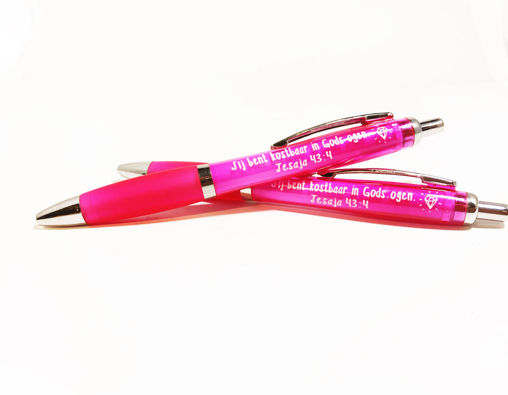 Schrijf met inspiratie en geloof met onze roze kunststof pen, bedrukt met het bijbelvers: "Jij bent kostbaar in Gods ogen - Jesaja 43:4." Deze pen is niet alleen een praktisch schrijfinstrument, maar draagt ook een krachtige boodschap van je eigenwaarde en betekenis in Gods plan. Of je nu aantekeningen maakt, je gedachten deelt of een boodschap van liefde stuurt, deze pen herinnert je eraan dat je kostbaar bent in de ogen van God. Een prachtig cadeau voor jezelf of een dierbare, deze pen verspreidt liefdevolle waarheid bij elke geschreven zin. Voel je gewaardeerd en geliefd, zoals het bijbelvers ons leert.