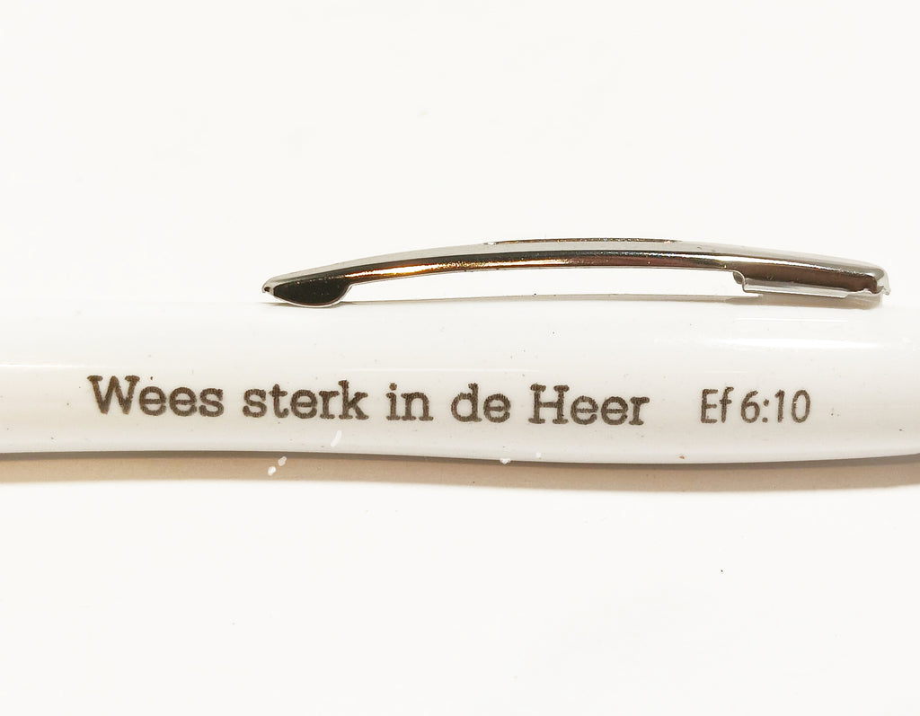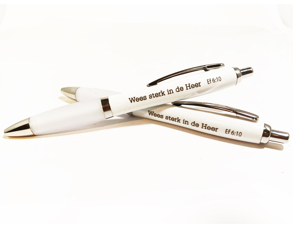 Schrijf met kracht en inspiratie met onze witte kunststof pen, voorzien van de bemoedigende boodschap "Wees sterk in de Heer." Deze pen is niet alleen een handig schrijfinstrument, maar draagt ook een opbouwende boodschap van spirituele kracht en vastberadenheid. Of je nu notities maakt, je geloof uitdrukt of bemoedigende woorden deelt, deze pen herinnert je eraan om standvastig te zijn in de Heer. Een prachtig cadeau voor jezelf of iemand anders, deze pen verspreidt positieve vibes bij elke geschreven regel. Laat deze pen je dagelijkse metgezel zijn en je aanmoedigen om sterk te staan in je geloof.