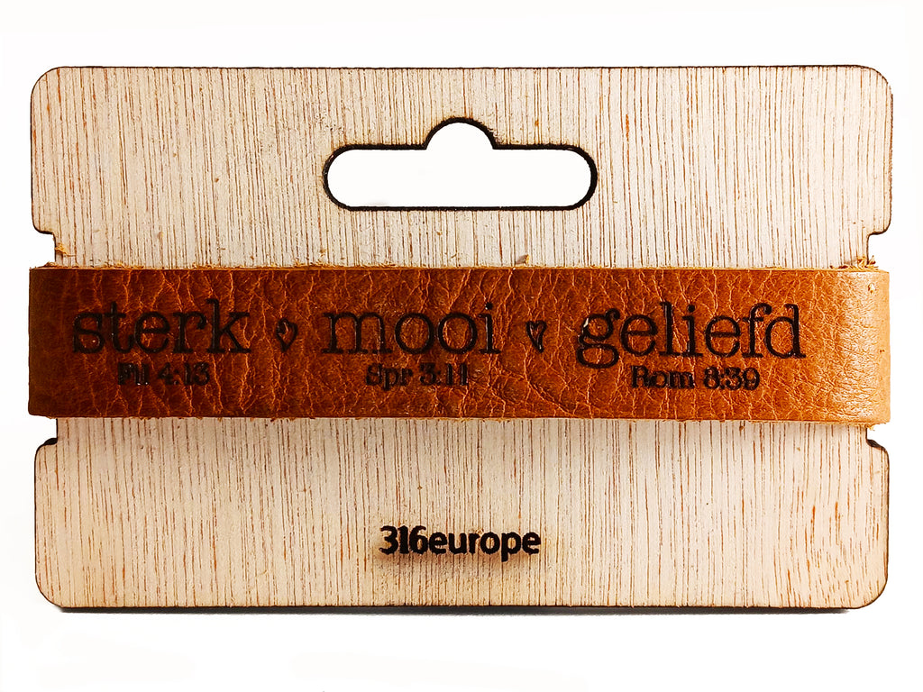 Bruin leren armband met de "Sterk Mooi Geliefd". Deze armband is niet alleen een stijlvol accessoire, maar ook een uiting van geloof en hoop. Met zijn verstelbare ontwerp in drie maten past hij comfortabel. In een eenvoudige, toch elegante design.