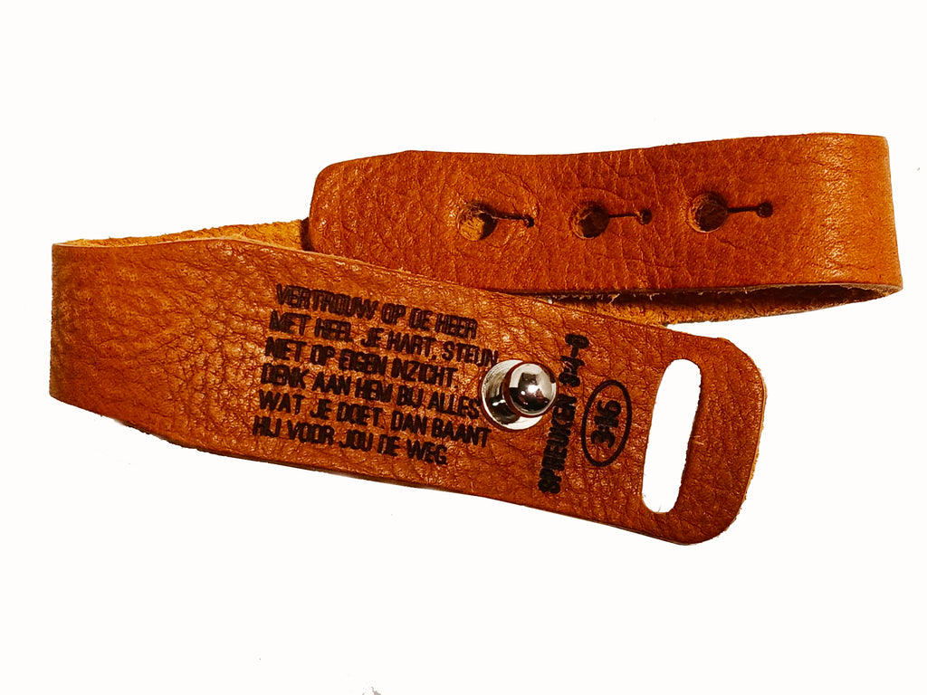 Bruin leren armband met de "Vertrouw op de Heer". Deze armband is niet alleen een stijlvol accessoire, maar ook een bevestiging van de hoop die Jezus geeft. Met zijn verstelbare ontwerp in drie maten past hij comfortabel. In een eenvoudige, toch elegante design.