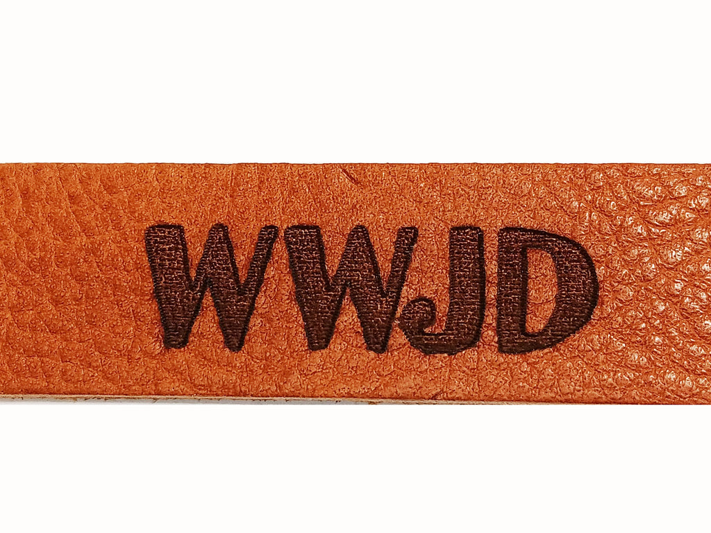 Brown Leather Bracelet, a testament to faith and style. Engraved with the the text "WWJD"(What Would Jesus DO), it serves as a constant reminder of our hope and salvation. Laser-engraved with care, this bracelet is adjustable in three sizes, ensuring a comfortable fit. Its simple yet elegant design makes it a versatile accessory for any occasion.