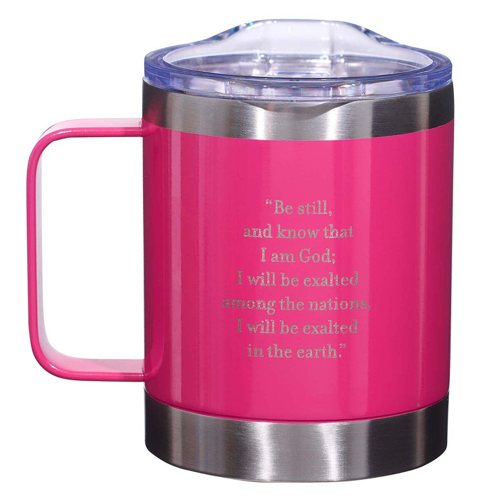Find comfort in the encouraging message of the Be Still Pink Camp Style Stainless Steel Mug, go about your day sipping your coffee or tea from a stylish mug, and know that God has sovereign power over your life.