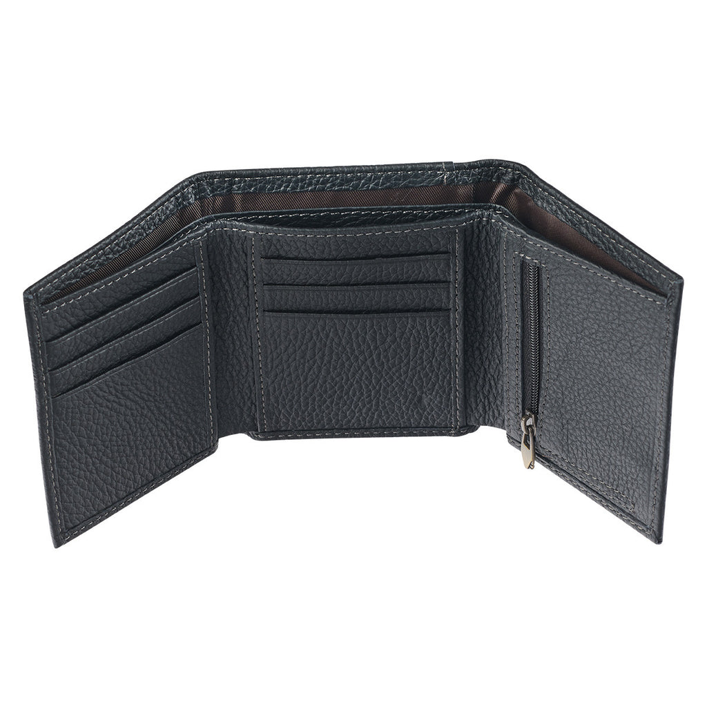 The two-section trifold men's wallet is topstitched along the edges for durability and features 6 credit card slots, 3 multi-purpose slip pockets, and a zippered coin pouch. An additional slip pocket can be found on the exterior back panel.