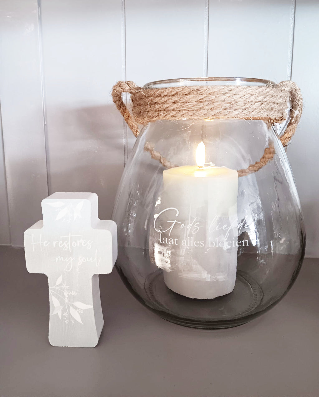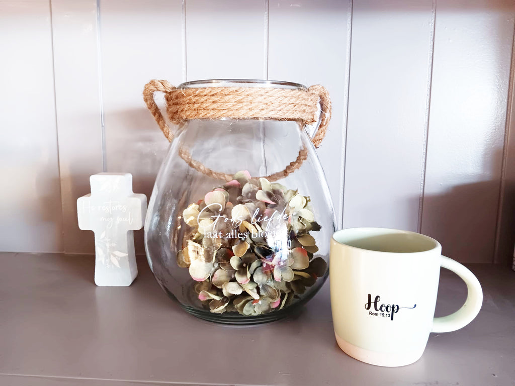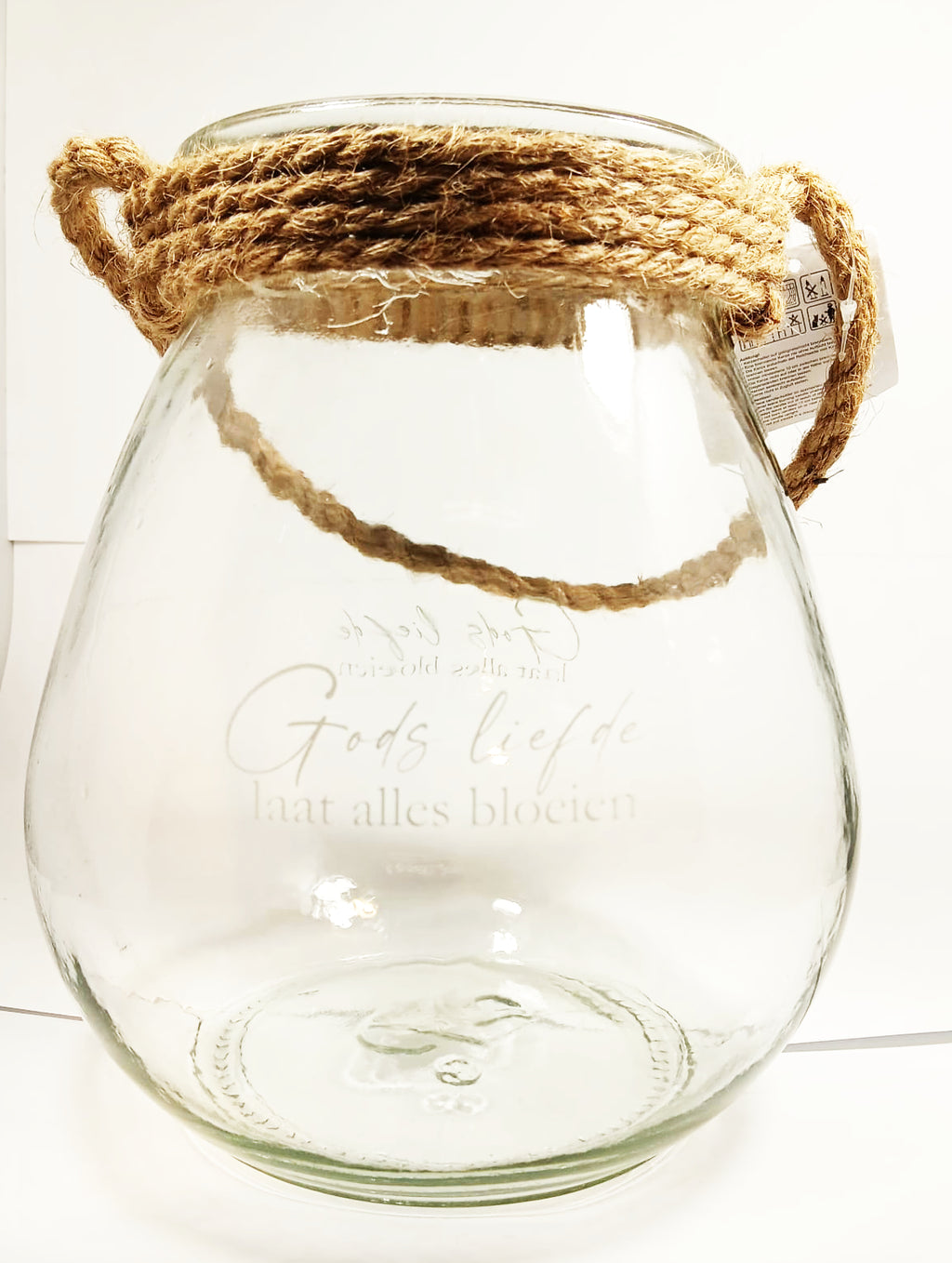 Dit prachtige, helder glazen bolvaas brengt elegantie en veelzijdigheid in elk interieur. Met een robuuste sizal hengel van 1 cm dik touw, vormt het touw een mooie versiering dat een natuurlijke uitstraling geeft. Eventueel is de vaas eraan op te hangen. Op zowel de voor- als achterkant prijkt in witte letters de inspirerende tekst: "God laat alles bloeien."