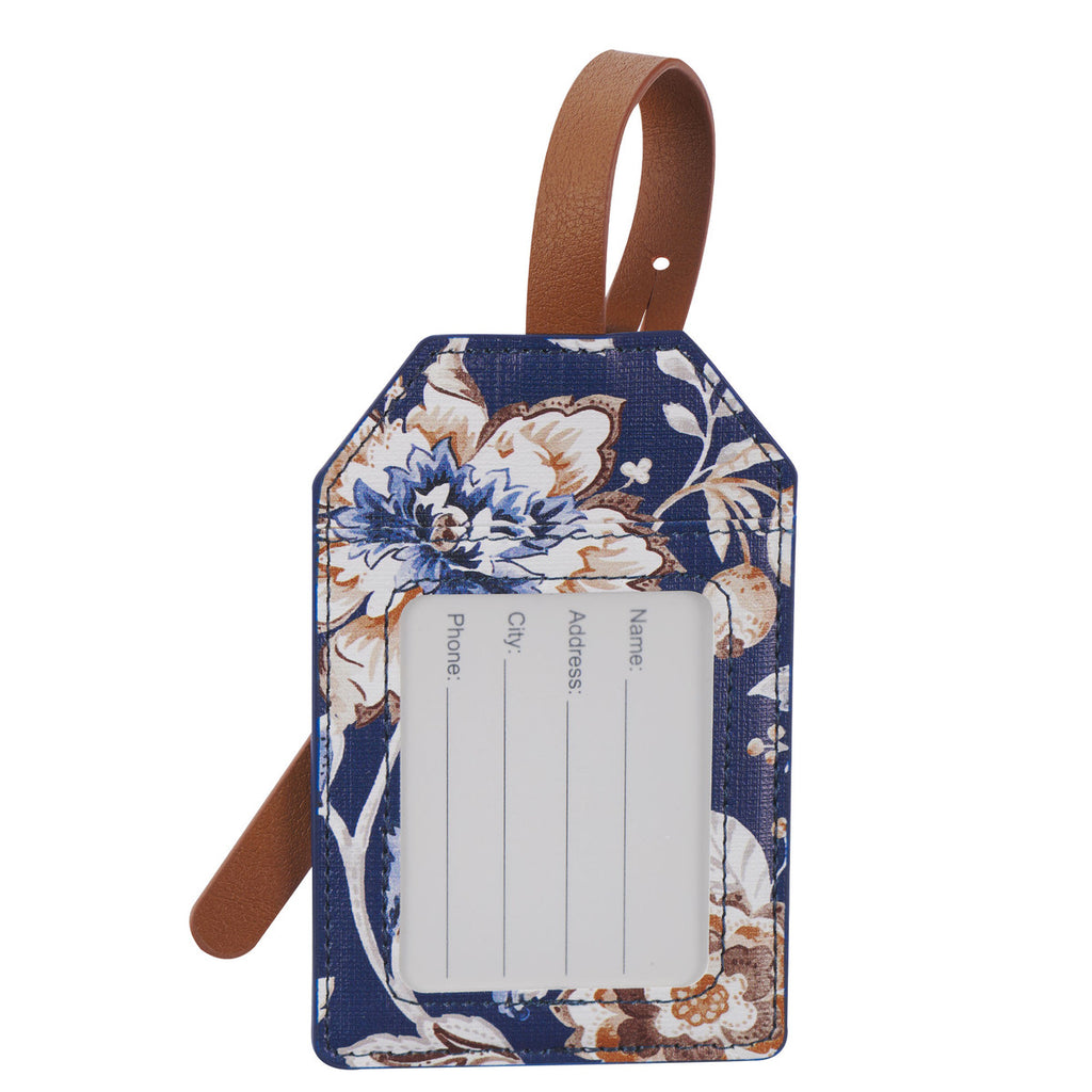 The elegant floral design is repeated on the reverse side of the luggage tag. This side showcases a clear plastic window paired with a slide-in card for your contact information. The edges and seams are reinforced with navy topstitching to ensure durability. The tag is completed with a honey-brown faux leather strap equipped with a sturdy metal buckle that will securely fasten to your suitcase or carry-on.