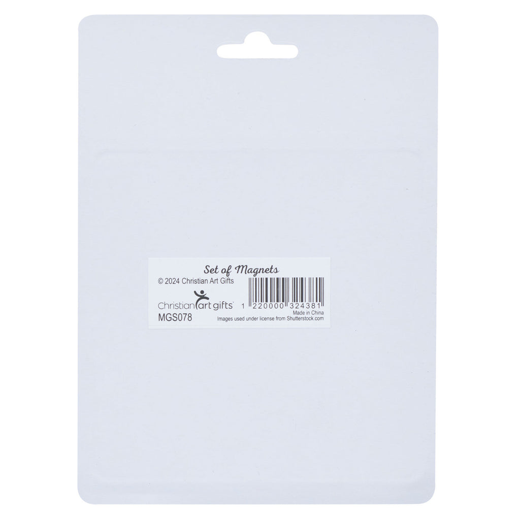 The set of four magnets is united by a blue floral theme and positive Scripture verses.