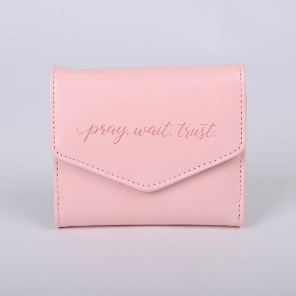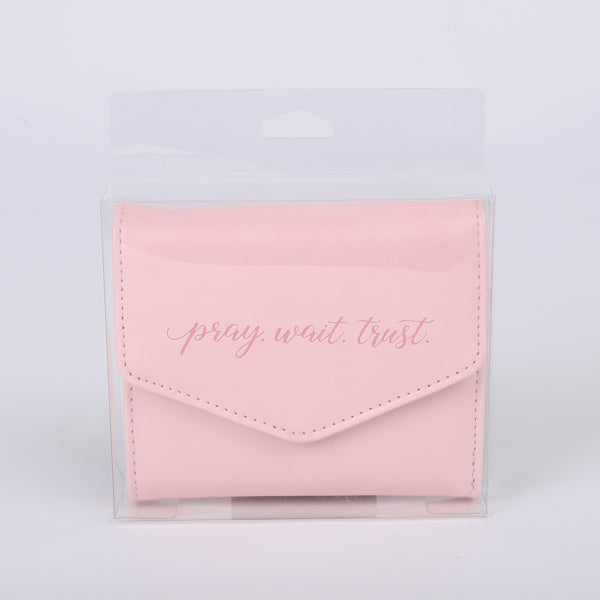 This pink imitation leather wallet is a perfect blend of elegance and functionality, designed to inspire and organize. The front is beautifully debossed with the words “Pray. Wait. Trust.” in a stylish script, offering a daily reminder of faith and patience. Its flap-style opening provides easy access while keeping your essentials secure.