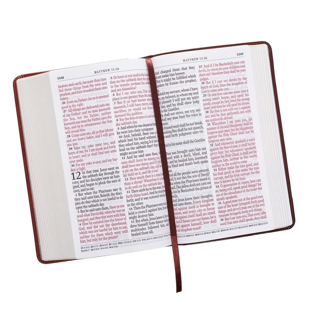 Met een gemakkelijk leesbaar 14pt-lettertype in een formaat met dubbele kolommen en een voetnootkruisverwijzingsgids, concordantie en een zoekfunctie voor actuele verzen, zult u deze editie met grote letters van de King James-bijbel doelgericht vinden voor studie en leesbaar zonder inspanning. De woorden van Christus zijn gedrukt in rode inkt en er zijn 8 volledig gekleurde geannoteerde bijbelkaarten. De editie bevat de inwijdingsbrief