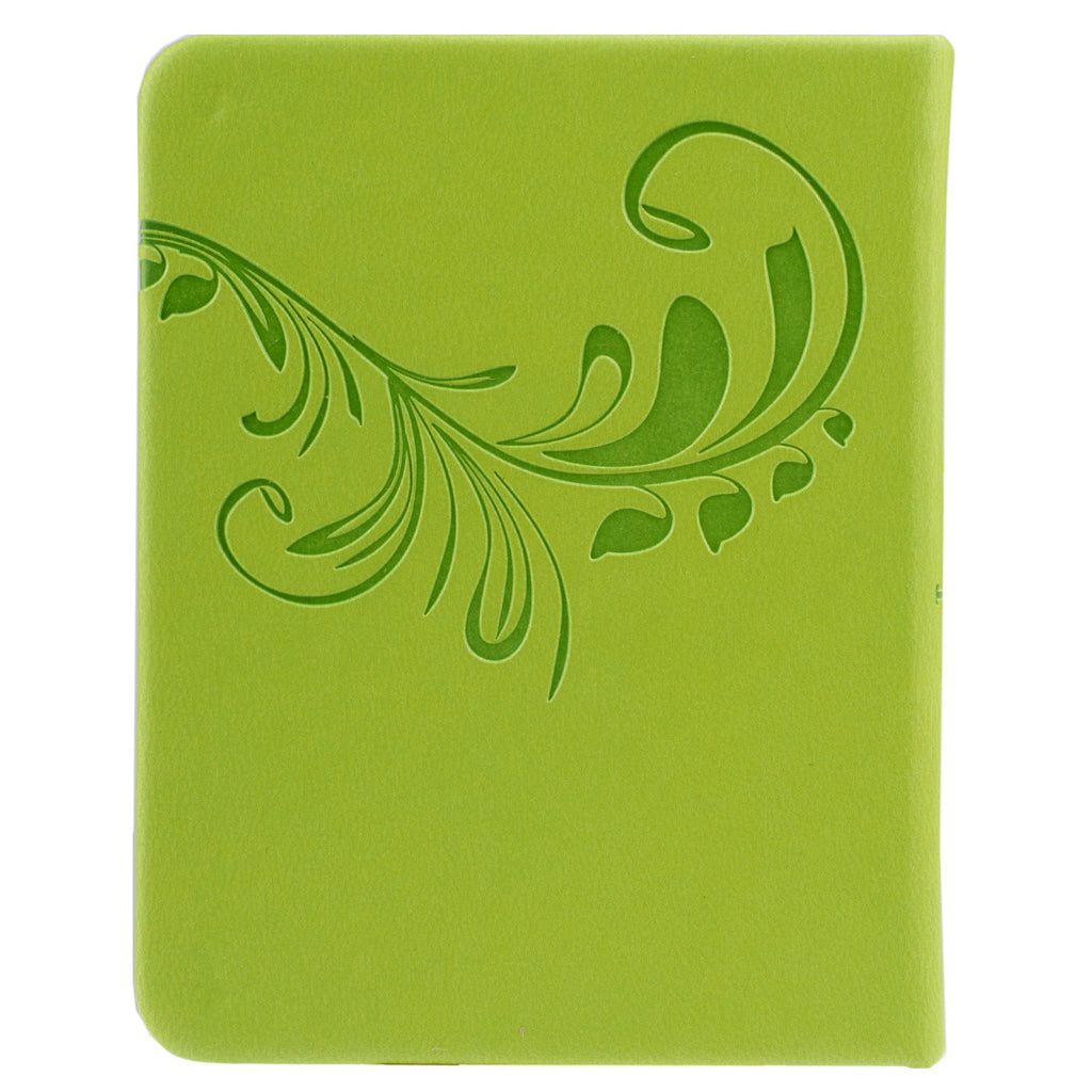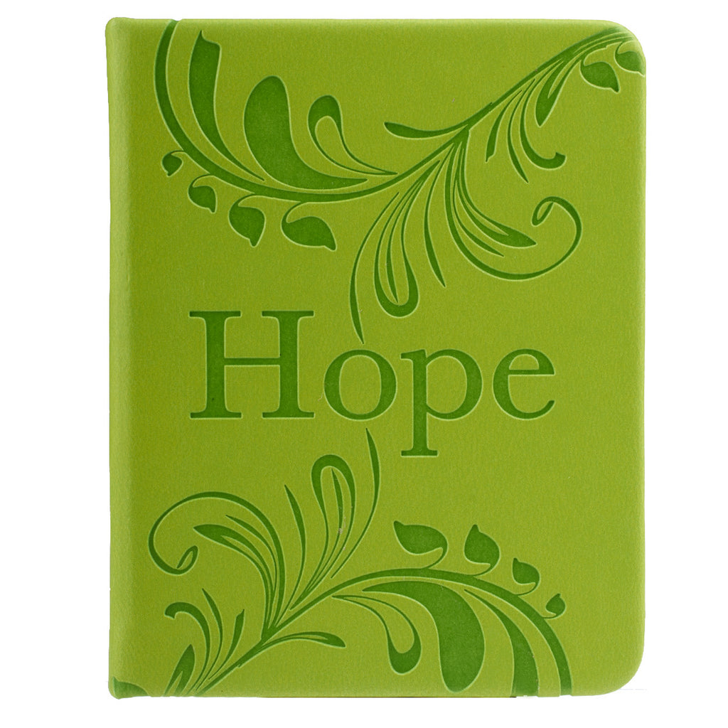 De titel "Hope" en een sierlijk filigraan zijn in reliëf aangebracht op de flexibele groene imitatieleren voor- en achterkant. De pagina's met een vergulde zilveren rand en een bijgevoegd leeslint creëren een vrolijke verpakking voor de inhoud.