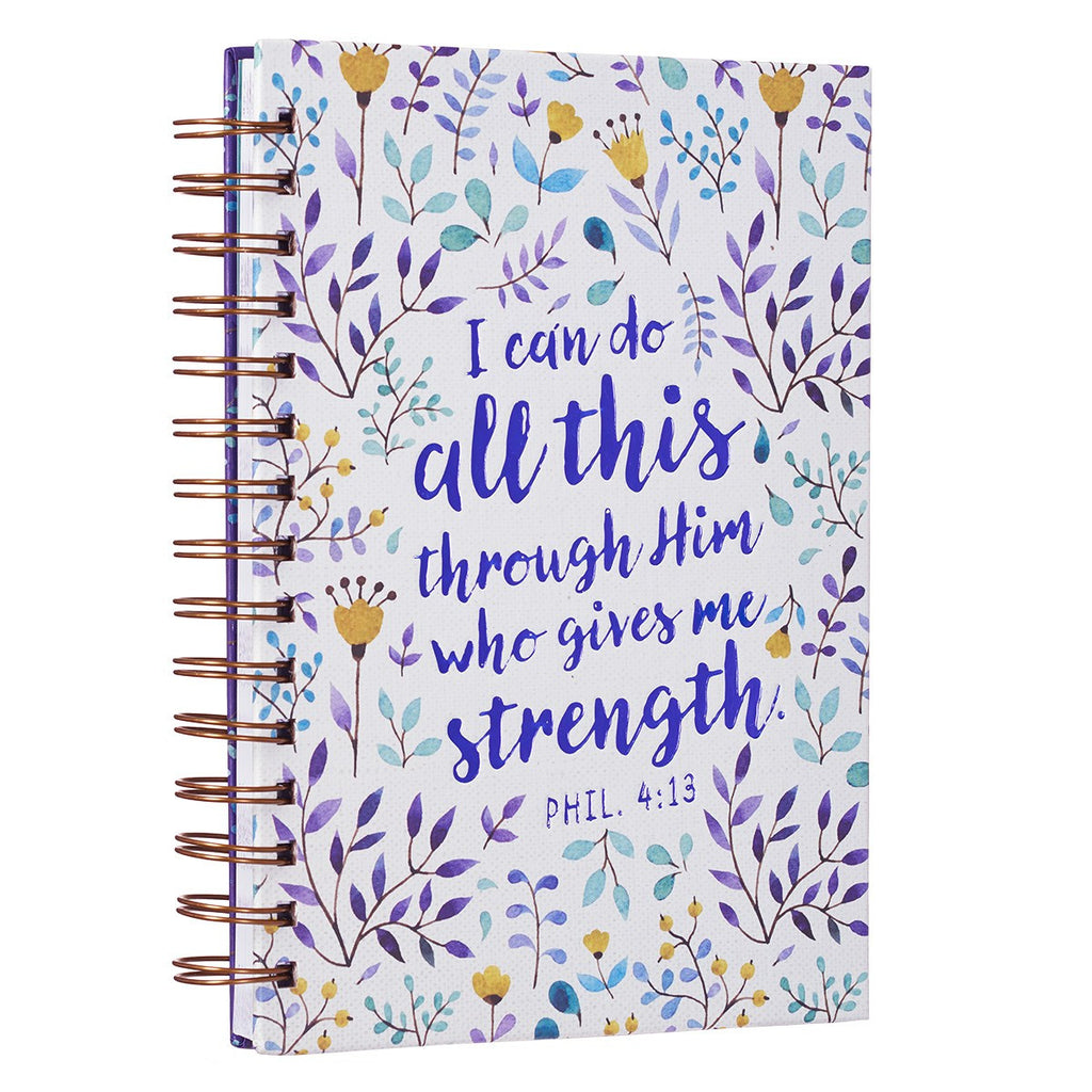 Het grote spiraalgebonden dagboek heeft een calico-ontwerp met felgele bloemen, bladeren en stengels in groen- en paarstinten, geëtst tegen een witte achtergrond. Dit prachtig ontworpen dagboek is versierd met paarse folietekst die de Schrift uit Filippenzen 4:13 duidelijk weergeeft: "Ik kan dit alles doen door Hem die mij kracht geeft." Dit hardcover dagboek is handig om aantekeningen te maken tijdens je stille tijd, omdat de spiraalbinding de kaft helemaal omvouwt, wat een fijn schrijfoppervlak oplevert. Het is zowel mooi als functioneel en vormt een geweldige aanvulling op je stille momenten van journaling.