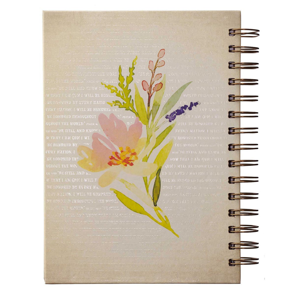 Dit grote hardcover dagboek met draadbinding heeft een bloemenkrans in een aquarelmotief op een gevlekte gelakte achtergrond met subtiel watermerk van de Schrift uit Psalm 46:10:
