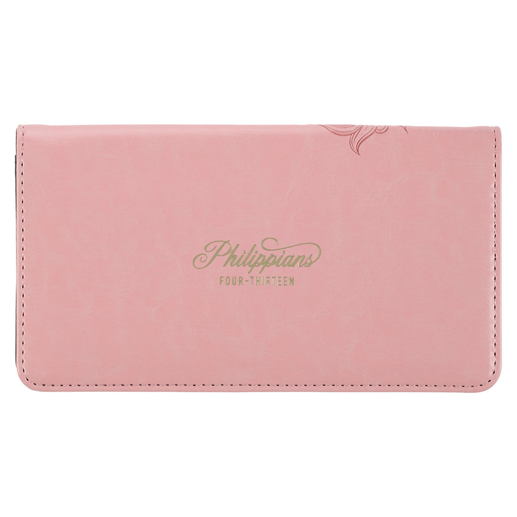 De Through Christ Fluted Iris Pink Faux Leather Checkbook Wallet herinnert de drukke christen eraan dat wanneer je op God vertrouwt, je tevreden kunt zijn in tijden van overvloed en in tijden van nood.