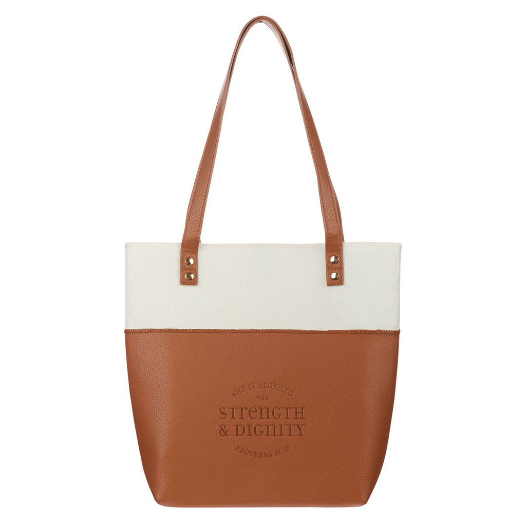Met de Strength & Dignity Two-tone Toffee and Cream Felt Fashion Bible Tote Bag kun je vol zelfvertrouwen op pad, wetende dat je al je benodigdheden bij de hand hebt. Dankzij de prachtige constructie is deze opvallende tweekleurige vilten tas een charmante gespreksstarter en het gesprek van de dag.