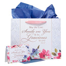 Lentevreugde en tijdloze elegantie komen samen in de Smile & Be Gracious To You Floral Large Landscape Gift Bag en Card Set. Deze stijlvolle tas is een snel, gemakkelijk en stijlvol alternatief voor standaard cadeaupapier. De Smile & Be Gracious To You Floral Large Landscape cadeautas en kaartenset, bedrukt met een zegen uit de Bijbel, zal een nieuwe vriendin, moeder of afgestudeerde student een glimlach bezorgen wanneer ze hem zien.