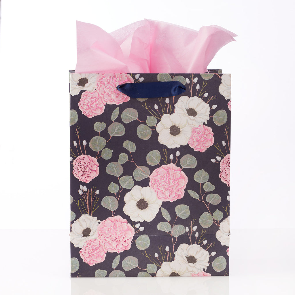 Witte klaprozen, roze anjers en delicate saliegroene bladeren dartelen op de zwarte achtergrond van deze opvallende geschenkzak en omlijsten deze kostbare woorden van onze Schepper, die ons eraan herinneren dat Hij God is: "Wees stil en weet" (Psalm 46:10). Wat een prachtige manier om je volgende cadeau te presenteren, ongeacht de gelegenheid, en tegelijkertijd een bemoedigende Bijbeltekst te delen.
