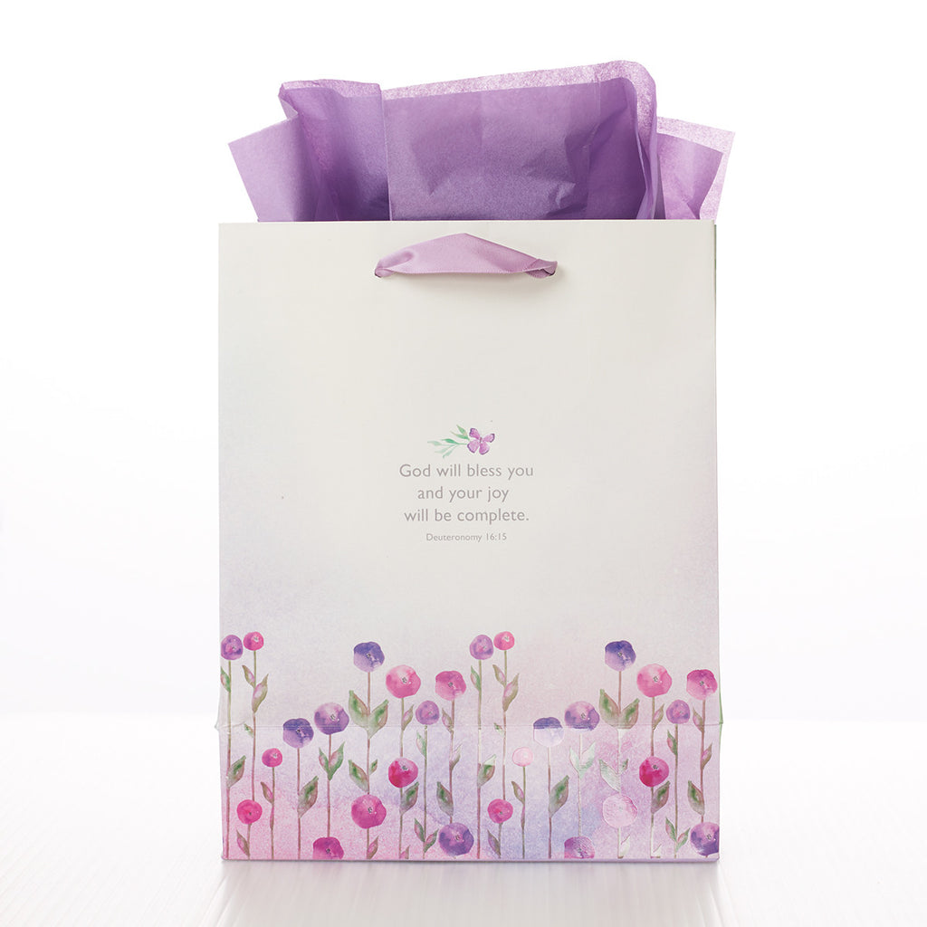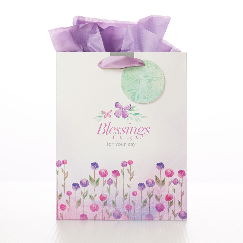 Deze cadeautas uit de Blossoms of Blessing-serie heeft een rand met een bonte compositie van paarse en roze boeketten tegen een zacht lila achtergrond. "Blessings for your day" staat centraal in het ontwerp. Een contrasterend rond cadeaulabel in groen zorgt voor een visuele noot. De achterkant van de cadeauverpakking toont dezelfde compositie, maar voegt de prachtige zegen "God will bless you and your joy will be complete" toe aan het ontwerp.