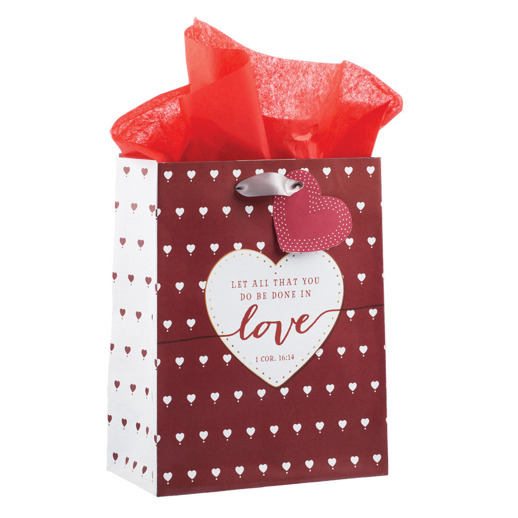 Verpak je Valentijnsdag-, bruilofts- of vrijgezellenfeestcadeau in de schattige Love Medium Gift Bag – 1 Korintiërs 16:14. Je geliefde die de christelijke gift bag ontvangt, zal het versierde hartpatroon en de bemoedigende tekst uit 1 Korintiërs 16:14 waarderen: "Laat alles wat je doet, in liefde gebeuren." Voordat ze haar cadeau uitpakt, leest ze het vers uit 1 Korintiërs 16:14 op de hartvormige gift bag en verheugt ze zich over het attente gebaar van liefde dat ze toont door haar een christelijk cadeau te geven.